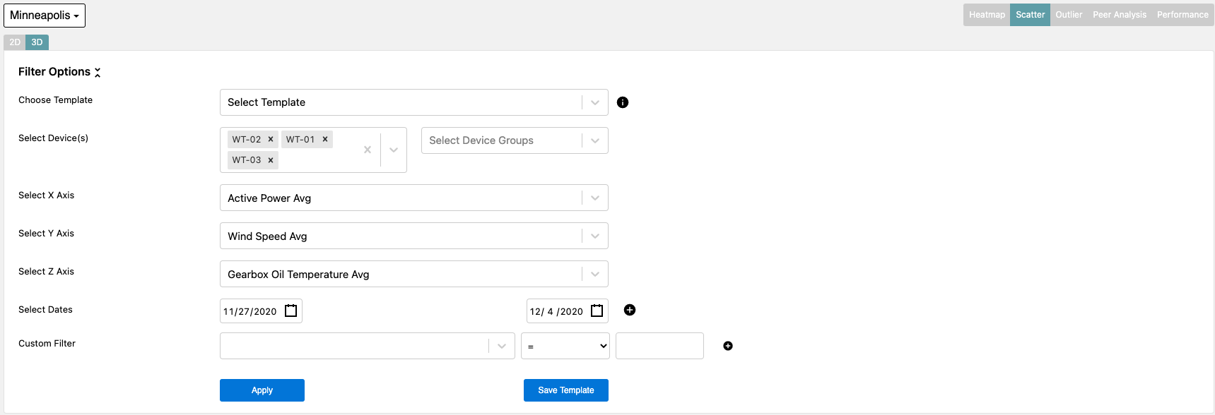 The Scatter module is the next tab over from the Heatmap module. This module allows for users to create a scatter plot of any data points available in the platform over specific date ranges for specific devices at the site.