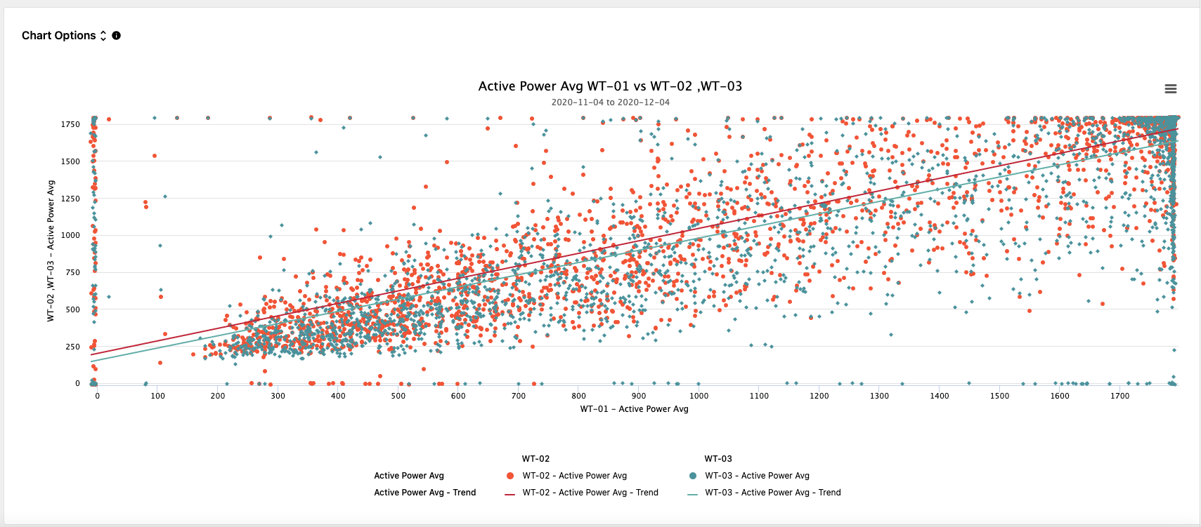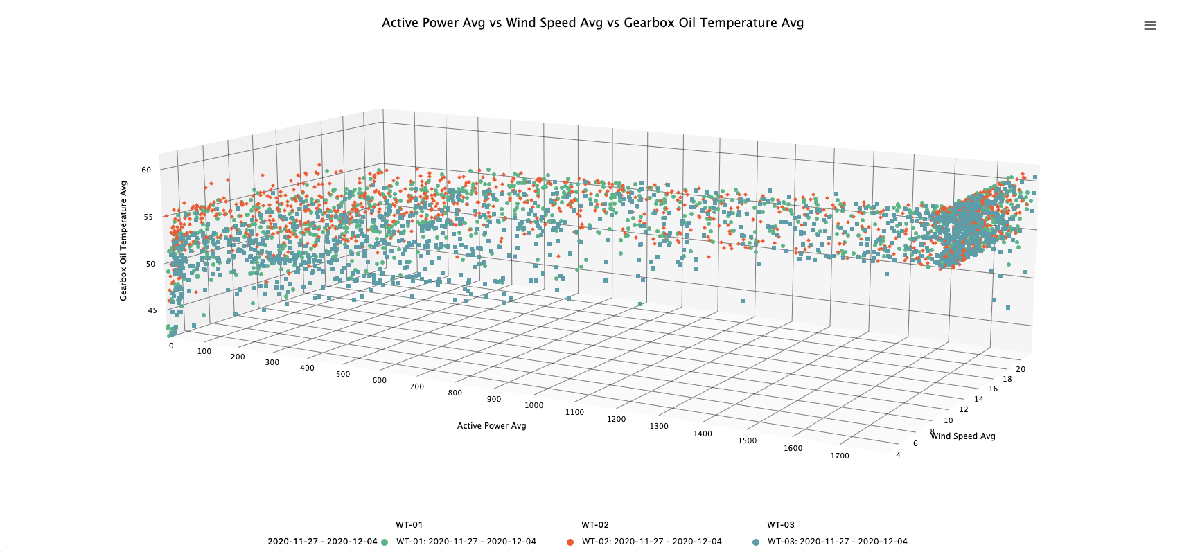 In this example, Active Power, Wind Speed Avg, and Gearbox Oil Temperature Avg are plotted. This can be very helpful for seeing if there is an additional relationship beyond a simple x-y relationship.