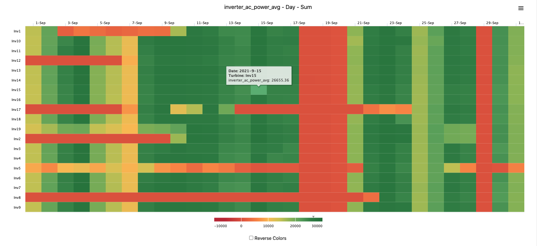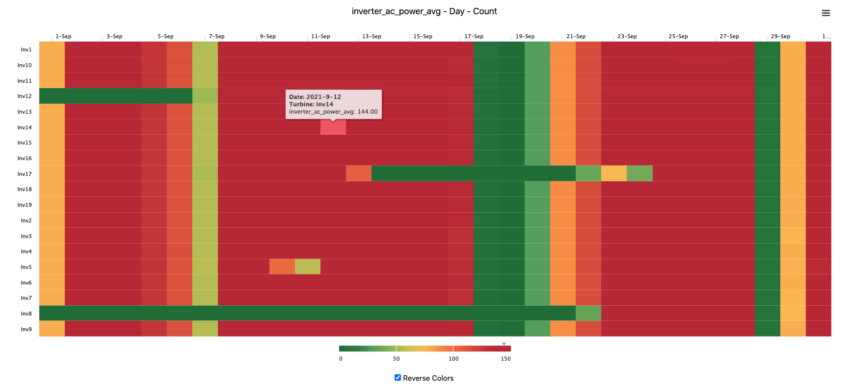 The resulting heatmap is shown below. From the result users can see that on September 18, 19, 20, and 21, it looks as though there was a site communications outage or offline event that effected all inverters. Since this is a Count aggregation, each day for a specific device tag should represent 144 data points as they are 10 minute data intervals. Less than 144 data points per day results in a different shade of color, red being the worst, dark green the best.