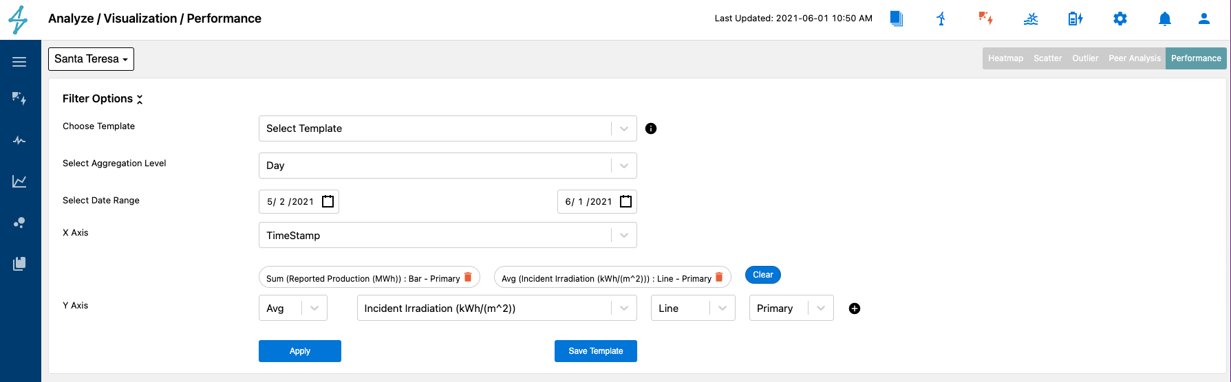 The performance tab allows for the plotting of various KPIs associated with the asset performance. These KPIs can be plotted in bar, line, or scatter format daily or monthly. Another attribute of this tab is the ability to overlay multiple plots by adding multiple KPIs on the same axis or plot them on a secondary axis to allow for appropriate scaling.