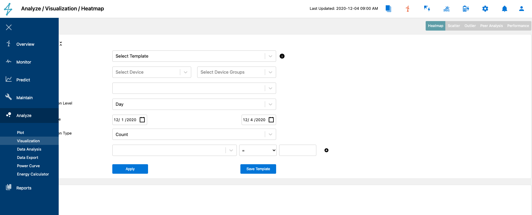 Once on the Heatmap tab, users can select their desired device(s), variables, aggregation level, date range, and aggregation type.